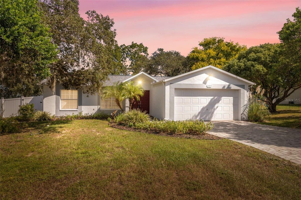 This spacious 4-bedroom, 3-bathroom home combines timeless design with peaceful surroundings, offering both comfort and functionality for everyday living. Set back on a quiet street, the home makes a strong first impression with its light exterior, mature landscaping, and a paver driveway that leads to a two-car garage. A slightly elevated front entry, lined with decorative rocks and manicured plants, draws you to the welcoming double doors beneath a warm overhead light. Inside, you're greeted by airy vaulted ceilings, soft neutral tones, and luxury vinyl plank floors that flow effortlessly through the main living areas. The living room’s open layout is enhanced by natural light streaming through large windows, while a statement ceiling fan with sculpted leaf-style blades adds a touch of character. The adjacent dining space offers a perfect setting for everyday meals or gatherings, illuminated by a classic chandelier with sliding glass doors that lead directly to the backyard. The kitchen brings both charm and practicality with white cabinetry, a tiled backsplash featuring mosaic accents, stainless steel appliances, and a breakfast bar illuminated by modern pendant lights. The primary suite is a private retreat with soft carpet, double closets, and an en suite bathroom complete with a walk-in shower, updated vanity, and framed mirror. Three additional bedrooms provide versatile living options for guests, family, or work-from-home space—each featuring ceiling fans, natural light, and ample closet storage. All bathrooms have been thoughtfully designed with neutral finishes and functional layouts, including one with accessible features such as a grab bar. The laundry area is conveniently located in the garage, offering storage shelves and a direct door to the backyard. Outside, the fully fenced yard offers a peaceful escape with a paved patio perfect for outdoor dining, a charming gazebo with railing, and a variety of mature trees that provide shade and privacy. There's also a shed for extra storage, making the backyard as practical as it is inviting. Located just 2.5 miles from Delta Woods Park, where you'll find walking trails, sports courts, and picnic areas, and only 3.1 miles from the famous Weeki Wachee Springs State Park, known for kayaking, crystal-clear waters, and natural attractions. For everyday convenience, shopping and dining options are less than 4 miles away. Plus, the Suncoast Expressway is just 6.7 miles from the home, providing a smooth commute to Tampa, making this property an ideal blend of quiet comfort and commuter convenience—ready to welcome you home.
